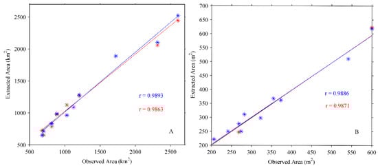 Comparison between the extracted and observed areas ((A)—water area, (B)—algal bloom area). (Blue-extraction results from the traditional methods optimized by the DL-NN; red-extraction results from the traditional methods; the extracted area refers to the extraction results from the MODIS images; observed area refers to the corresponding the extraction results from the Landsat images).