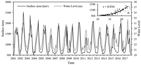 Relationship between the lake water area and water level. A is a scatter plot of the correlations.