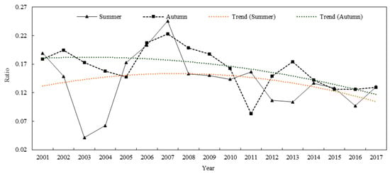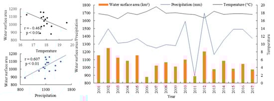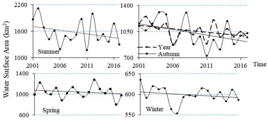 The seasonal and interannual changes in the water area of Dongting Lake from 2001 to 2017 are shown in Figure 5. The water area of the lake displayed a declining trend between 2001 and 2017, with a minimum in 2011 at an area of 888.17 km2; the maximum was reached in 2002 with an area of 1249.43 km2. The water surface area of Dongting Lake changed seasonally; the lake area was small in spring and winter and larger in spring (approximately 1000 km2) than in winter (550–650 km2). The lake area was large in both summer and autumn but peaked in summer; the largest area of 2114.32 km2 occurred in the summer of 2002. In addition, the surface area of Dongting Lake in spring, summer, autumn, and winter showed a decreasing trend from 2001–2017; the largest rate of decrease was in summer, and the summer variation rate reached −16.49 km2/a, followed by a rate of −14.93 km2/a in autumn. The rates of decrease were small in spring and winter at −4.05 km2/a and −0.88 km2/a, respectively. These characteristics are related to precipitation, temperature conditions, the operation of the Three Gorges Reservoir (TGR), and the main flood season of the Yangtze River in the Dongting Lake region [,].