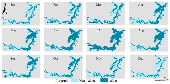 In numerous studies, the MNDWI has been demonstrated to be an effective and high-precision index for extracting the area of surface water []. The MNDWI was applied to the MODIS data in this study because it extracts water bodies more accurately than the NDWI [,,]. Noise from built-up land, soil and vegetation can be reduced using the shortwave infrared (SWIR) and green bands, thereby enabling water boundaries to be accurately identified. Generally, the MNDWI values of water areas are positive, whereas the MNDWI values of soil, vegetation, and built-up land are negative. Therefore, the appropriate extent of Dongting Lake can be calculated by selecting an appropriate threshold for the MNDWI. Some binary MNDWI images can improperly delineate the boundaries of areas where clouds and shadows exist; in such cases, manual editing and merging are used to obtain the correct lake boundary. The MNDWI is expressed as follows: