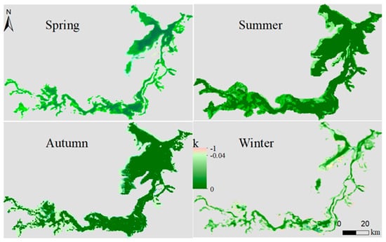 For a more detailed understanding of the spatial patterns and regional differences in the water surface changes in different areas, the per pixel frequency of water detection in each season from 2001 to 2017 was calculated, and the slope (k) (Figure 7) is shown. The frequency of water detection was calculated as the number of times water was identified in each pixel from a stack of all water/non-water classifications for each season of the year. From 2001 to 2017, strong interannual variation in spatial water frequency patterns across the Dongting Lake was detected from our pixel-level analysis (Figure 7), revealing striking differences between years. The frequency of water detection decreased significantly in all four seasons in the East Dongting Lake. The frequency of South Dongting Lake decreased in the three seasons including spring, summer and autumn. The frequency decrease of the West Dongting Lake was mainly observed in summer and autumn. The frequency reduction of these three lake areas occurred dominantly in the lakeshore area.