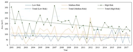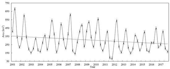 The statistics of the algal bloom outbreak areas in Dongting Lake during different seasons from 2001 to 2017 (Figure 8) indicate that the algal bloom area in Dongting Lake exhibits a normal distribution within a 1-year period and that most algal blooms occur in the summer and fall seasons. This abundance of algal blooms is associated primarily with the high water temperatures in summer and autumn that provide suitable conditions for algal growth. The area of algal blooms in Dongting Lake was the largest in summer, followed by autumn, and the smallest areas were observed in spring and winter. Between 2001 and 2017, the annual average area of algal blooms reached approximately 233.02 km2 in 2003 and 2004 when the algal bloom area was small and reached a maximum of 413.47 km2 in 2001. In general, the area of algal blooms in Dongting Lake showed a declining trend over the study period spanning nearly 17 years.