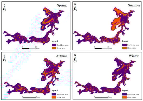 The regions of algal bloom occurrence in Dongting Lake during different seasons from 2001 to 2017 were statistically analyzed, and distribution maps of the algal blooms in different seasons were obtained (Figure 9). Eastern Dongting Lake experienced more frequent algal blooms than the other two regions of the lake, and the area of algal bloom occurrence was concentrated mainly in the easternmost part of the lake. The largest area occurred in summer, followed by autumn and spring, and the smallest algal bloom area occurred in winter. The largest algal bloom areas occurred near the lakeshore in western and southern Dongting Lake, while the center of the lake exhibited the smallest algal bloom area. Furthermore, western and southern Dongting Lake experienced more frequent algal blooms in autumn than during the other three seasons. For the whole lake, the algal blooms expanded to the center of Dongting Lake after spring and then decreased after summer.