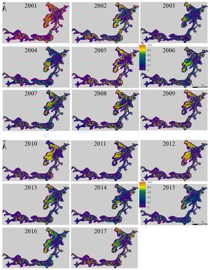 The frequencies of algal blooms in different areas of Dongting Lake from 2001 to 2017 were similarly analyzed (Figure 10). Algal blooms occurred in all 17 years and were distributed primarily near the lakeshore. Blooms occurred very frequently in 2001 with an occurrence rate exceeding 50% near the western shore of eastern Dongting Lake, and eastern Dongting Lake showed the largest area with significant bloom coverage. The frequency of algal blooms was low in 2003 and 2004, mainly at 20–30%, except in the northwestern and southwestern parts of eastern Dongting Lake.