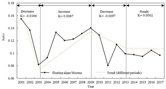 Algal blooms in Dongting Lake occur mainly between April and September. To more clearly ascertain the interannual changes in algal blooms, we analyzed the average area of algal blooms in Dongting Lake during April to September from 2001 to 2017. The monthly maxima is more representative of the monthly water bloom coverage than the monthly average value due to the influence of wind on the formation of the surface mats [,]. Therefore, on the basis of this argument, the annual bloom coverage for the lake were estimated from the mean of monthly maxima, in which these months were from April to September. Then we also calculated the average of the water area extracted from April to September, and finally a time-series of bloom changes was determined using the annual bloom coverage compared with the average of the water area extracted. The results are presented in Figure 11. The changes in the algal bloom area showed decreasing, increasing, decreasing and stabilizing trends over time; accordingly, the changes in the algal bloom area of Dongting Lake were divided into four periods. First, the algal bloom area of Dongting Lake gradually decreased from 15.46% in 2001 to 8.15% in 2003 with an average annual reduction of approximately 3.66%. The second phase was a period of expansion that occurred from 2003 to 2009, during which the ratio of the algal bloom area to the area of Dongting Lake increased by approximately 0.87% per year. The third phase (2009–2013) was another decreasing period. After 2009, the algal bloom outbreak area in Dongting Lake gradually decreased, with the algal bloom area reaching 9.91% in 2013. Finally, the fourth phase (2013–2017) was a stable period, during which no significant increase or decrease in the algal bloom area showed in Dongting Lake.
