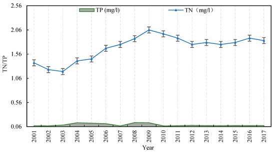 Field investigations were performed monthly at predefined sites across Lake Dongting from 2001 to 2017 to obtain (1) manual outlines of the area where known aquatic macrophytes exist based on field observations and (2) field observations of nutrients (including total nitrogen (TN) and total phosphorus (TP)) and of chlorophyll-a (Chl-a concentration ≥0.01 mg/L, at which algal blooms accumulate on the surface of the water). These data were used to modify the extraction results of the Landsat 7 ETM+ and MODIS images because the algal blooms depended significantly on variations in the TN and TP concentrations [].