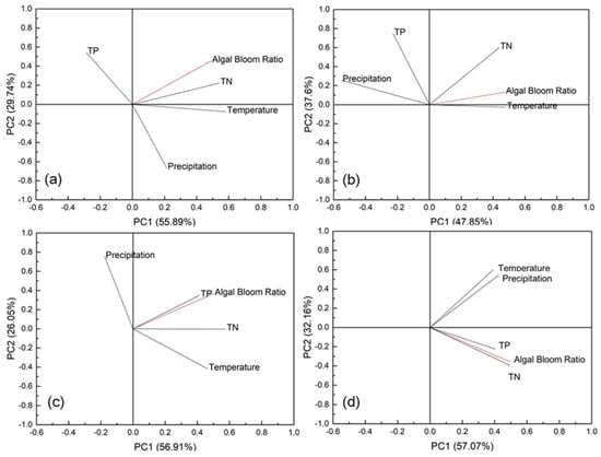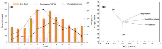 The western and northeastern sections of eastern Dongting Lake experienced more frequent algal blooms than the other two sections of the lake, where the algal blooms tended to expand from the shore to the center of the lake. The frequency of algal bloom occurrence decreased gradually from the shore to the interior of the lake area. There are 17 major pollution sources around eastern Dongting Lake, with a daily discharge volume of 126,359 m3, accounting for 85.55% of the total daily discharge; accordingly, large quantities of pollutants have been discharged into the lake from agriculture, industries, and aquaculture, resulting in nutrient concentrations that are significantly higher in the eastern part of Dongting Lake than in the western and southern parts of the lake [,]. The northeastern region of eastern Dongting Lake is simultaneously located near both the city of Yueyang, which shows considerable growth potential with a large population and widespread industrial activities, and the confluence of eastern Dongting Lake and the Yangtze River, where numerous pollutants accumulate and are released from the lake sediments due to disturbances from the Yangtze River. Therefore, significant algal blooms appeared in the northeastern part of eastern Dongting Lake. In contrast, the western region of eastern Dongting Lake is restricted by its geographical location and is not impacted by the estuary, and the amount of water in this area is low. In addition, the terrain of Dongting Lake is high in the northwest and low in the southeast. The water flows from west to east through Chenglingji into the Yangtze River, and thus, water exchange does not occur frequently in the western part of the lake. Moreover, the water variability is small, and pollutants accumulate more easily in this area than in other areas, resulting in water quality deterioration. This nutrient pattern is the primary reason for the obvious west-to-east decrease in the algal bloom occurrence frequency.