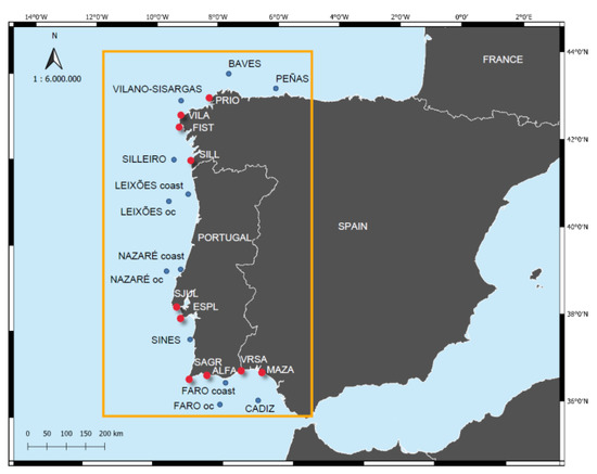 Study area—Western Iberian Peninsula. Blue dots: wave buoy positions; red dots: high-frequency radars (HFR)’s site location; orange rectangle: the study area.