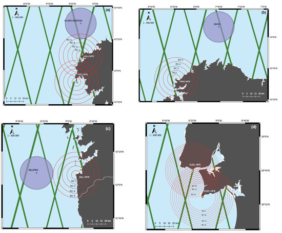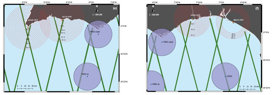 Wave data HFR coverage area. (a) VILA and FIST HFRs (RCr = 5.1 km); (b) PRIO HFR (RCr = 5.1 km); (c) SILL HFR (RCr = 5.1 km); (d) SJUL HFR (RCr = 1.85 km) and ESPL HFR (RCr = 2.15 km); (e) SAGR and ALFA HFRs (RCr = 1.85 km) and (f) VRSA HFR (RCr = 1.51 km) and MAZA HFR (RCr = 1.67 km). Red circles: RCs; blue dots: wave buoy locations; green lines: Sentinel-3 tracks and blue circles: 10 NM area for in situ and SA comparisons.