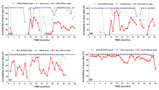 Availability of in situ and matchable HFR wave data during the study period (36 months). (a) PRIO HFR (RC-5)/Baves buoy; (b) VILA HFR (RC-5)/Villano-Sisargas buoy; (c) SILL HFR (RC-5)/Silleiro buoy, and (d) ALFA HFR (RC-15)/Faro coastal buoy. Blue dashed lines with dot markers: wave buoy data availability; Grey lines with triangle markers: total HFR wave data availability; red lines with circle markers: HFR wave data availability after excluding the nulls and spurious values.