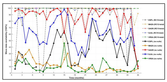Figure 5 shows the wave data availability for the 12–13.5 MHz HFR sites. ALFA HFR (13.5 MHz) was already presented in Figure 4d. After discarding the nulls and spurious values, VRSA and MAZA HFR sites have shown to have the lowest availability of wave data, which can be partially justified by these sites’ location in a sheltered area in the south of the Iberian Peninsula. In these coastal areas, the annual mean wave height value is lower than 2 m. The second-order spectra echoes can be very weak for lower sea states, and spurious features in the spectrum can contaminate the wave parameter estimation [36]. ESPL HFR shows low consistency on the quantity of available wave data (no nulls), and SJUL and SAGR are the sites with the higher wave data availability.