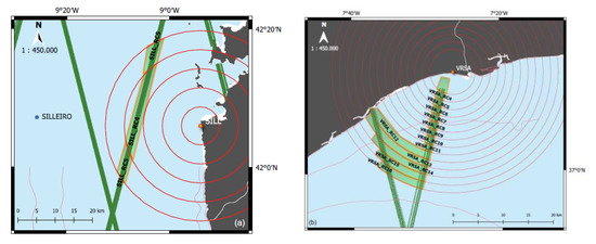 Sentinel-3 tracks over HFR RC. Exemplificative schema for (a) SILL HFR and (b) VRSA HFR. Green tracks: Sentinel-3 tracks with SRAL measurements; red circles: RC; blue dot: Silleiro buoy.