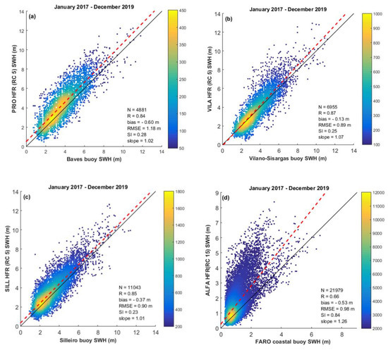 Comparisons between buoy and HFR SWH (density scatter plots). Statistics metrics are gathered on the right bottom side. N represents the number of coincident hourly observations, and the red dashed lines are the best linear fit of the scatter plots. Density scatter plot: (a) Baves buoy vs. PRIO HFR (RC5); (b) Villano-Sisargas buoy vs. VILA HFR (RC5); (c) Silleiro buoy vs. SILL HFR (RC5) and (d) Faro coastal buoy vs. ALFA HFR (RC15). The colored bar represents the density of the scatter plots.