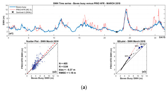 Regarding the NW area of the Iberian Peninsula, covered by three of the HFR sites (Figure 8: a-PRIO; b-VILA and c-SILL), the effects of the Emma storm were felt later, on 11 March. Values above 8 m of SWH were captured by Villano-Sisargas and Silleiro buoys. These extreme wave height values correspond to swell, originated by the storm passage between the Azores archipelago and the Iberian Peninsula. SILL and VILA HFR sites also captured similar values (slightly overestimated) for March 2018. PRIO HFR and Baves buoy are geographically located in a more sheltered area, and for that matter, measured lower values. In March 2018, all three sites registered another extreme wave height event (on the 24th), with values between 9–10 m. These plots further confirm a slight underestimation of the lowest SWH values by the HFR sites, also depicted in the time series graphics.