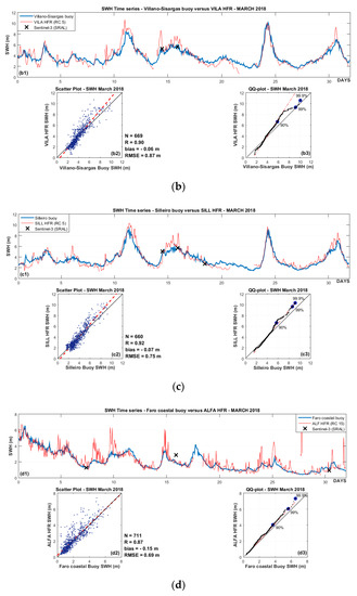 Figure 8(a3,b3,c3,d3) depict the HFR-buoy SWH QQ-plots. The QQ-plots confirm the overestimation mentioned above of the HFR SWH measurements, particularly for high-sea states and wave height events above the 90th percentile. Extreme wave events occur between the 90th and the 99th percentiles [34,51]. Through the analysis of the QQ-plots, at Galicia (Algarve) region, a wave height above 6 m (4 m) can be considered an extreme event. On 1 March 2018, Faro coastal buoy captured SWH = 6.5 m. The ALFA HFR site also captured this value during the same period (Figure 8(d1)). The black crosses, shown in the time series plots (Figure 8(a1,b1,c1,d1)), represents the SRAL SWH observations, where the high correlation with in situ observations is clear.