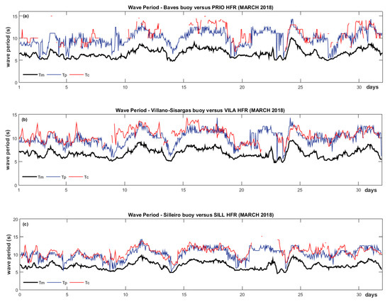 In the SeaSonde CODAR HFR systems, the wave period is considerably more sensitive to noise in the radar backscatter than SWH, particularly in low sea states [20,36]. As discussed in previous sections, buoy and HFR provide different outputs for wave periods. HFR systems retrieve a period representing the centroid of the model fitted to the spectral data (Tc—centroid period). At the same time, buoy provides Tp and Tm [18,36]. Tc can be assumed as a stable estimator as Tm, while being more stable than Tp, which is noisier [37]. Theoretically, Tc should be between Tm and Tp [19,36,37]. The HFR Tc was compared to the Tm, and Tp outputs from the buoys (where available) to achieve which buoy period correlated best with the CODAR SeaSonde wave period. As Tp is always longer than the Tm from buoys, it sometimes represents swell when the swell is present. However, its utility as a precise parameter is cast in doubt by its significant statistical uncertainties. Figure 9 displays the different wave periods comparison, through time-series of one exemplificative month (March 2018).