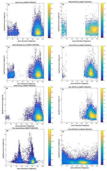 Density scatter plots of SWH (m) vs. wave direction (JAN2017-DEC2019). (a) Baves Buoy; (b) PRIO HFR; (c) Villano-Sisargas buoy; (d) VILA HFR; (e) Silleiro Buoy; (f) SILL HFR; (g) Faro coastal buoy and (h) ALFA HFR. (a,c,e,g) in situ sensors and (b,d,f,h) HFR wave data. Central colored bar legend represents the density of both scatter plots.