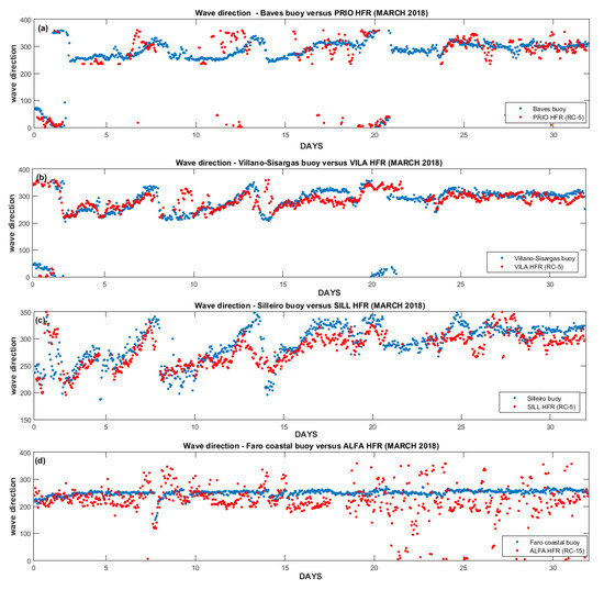 Wave direction time series buoy vs. HFR (March 2018). (a) PRIO/Baves buoy; (b) VILA/Villano-Sisargas buoy; (c) SILL/Silleiro and (d) ALFA/Faro coastal buoy. Blue dots: buoy wave direction and red dots: HFR wave direction.