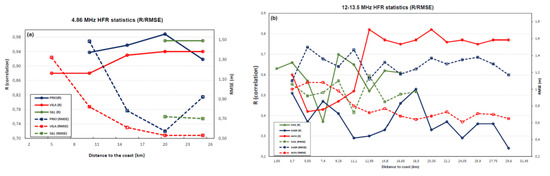 Root-mean-squared error (RMSE) and correlation (R) between HFR-SRAL SWH measurements as a function of distance to coast (km). (a) 4.86 MHz HFR sites (red: VILA; blue: PRIO and green: SILL); (b) 12–13.5 MHz HFR sites (red: ALFA; blue: SAGR and green: SJUL). Dashed lines: RMSE (m) and solid lines: R.
