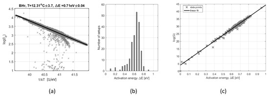 In Figure 2, we selected three plots from our previous study [14], which should be presented here for better readability of the current paper. The following plots show: (a) an exemplary logarithmic dependency of DC in a random pixel showing that it follows the equation Equation (2); (b) the histogram of calculated activation energies with a peak around 0.68 eV; (c) the plot confirming NMR rule present in our sensors with the linear fit assuming = 24.8 ± 0.1 meV.