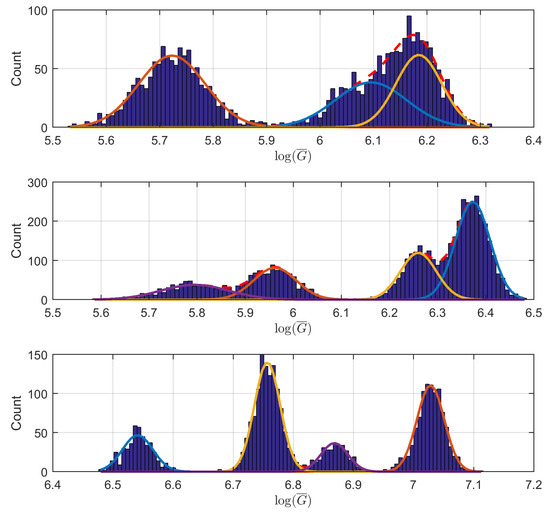 The goal of this study is to find and investigate the locally stable values of . We use the histograms of values calculated after normalization with Equation (5); then, we apply the Gaussian mixture model to fit a collection of Gaussian curves to the data of each setup. The fitting is performed 10 times for each defective pixel with a limit of 1000 iterations, random starting points and a rising number of Gaussians components from 2 to 12. The model quality is evaluated with the Akaike information criterion (AIC) [22] for each solution. The modeling with unknown number of distributions in a mixture is usually problematic because the models with higher numbers of Gaussians usually fit better to the data. Fortunately, the AIC coefficient allows for finding a trade-off between the information loss and the simplicity of a model. After visual investigations, we admit that this kind of criterion works well for our data. In Figure 7, we show several outcomes of the modeling of distributions. The calculation of models for the whole data set required almost three weeks of uninterrupted work of an 8-core I7 CPU.