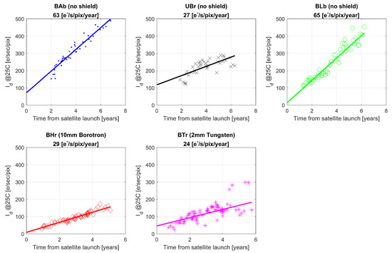 The two shielded satellites (BHr and BTr), as well as the one unshielded (UBr), show a similar increase of DC with time. However, the three corresponding plots differ greatly. The BHr shielded with 10 mm Borotron behaves stably over time and the plot shows low scatter. This means that the DC shows similar statistics over the whole matrix, so the positions of rasters do not have a great impact on the calculated mean DC. This is much different in the BTr satellite, where strong scatter indicates that, although the mean DC shows similar growth, the calculations depend heavily on the selected set of rasters. Interestingly, we found that the observed accuracy of the astronomical photometry in BTr is closer to that obtained in the unshielded satellites. This is because the unshielded satellites and BTr have a similar number of defective pixels, while in BTr, only the DC generation is lower. The last of the three satellites showing slower growth is UBr—the most mysterious one. For the first 4 years of mission, the points were arranged along the line showing a growth similar to the one seen in the remaining unshielded satellites. However, the points from the 3 most recent years show the average DC much smaller than predicted; they are even at the same level. This is the only one satellite which shows this kind of saturation. There is no significant difference in temperature of operation among satellites which would result in a bigger chance for annealing, so the source of this phenomenon remains inexplicable. Interestingly, the three satellites exposing slower generation growth include the red filter. They are installed in the closest proximity of CCD matrix, so if the red filters and the blue ones differ in the absorption properties, they may have some additional impact on the observed degradation process.