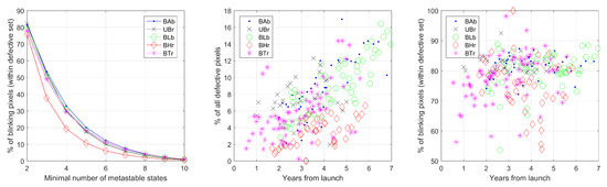 The plots in the middle and on the right side of Figure 9 show the evolution of the total number of defective and blinking pixels, respectively. BTr follows the growth of the unshielded satellites, although its total DC is significantly lower as presented in Figure 8 and in Table 2. As expected, the percentage of damaged pixels increases with time—slower for BHr and faster for the other satellites. Currently, we reach a total of 10–15% of pixels affected by higher DC in BAb, UBr, BLb and BTr, while in BHr, this value is closer to 5–10%. Importantly, the total percentage of blinking pixels (at least two metastable states) in the defective set remains constant for all years of mission; this can be seen in the right plot of Figure 9. This value oscillates around 80%. The spread of points in the two plots is natural and appears due to the limited number (15–20) of rasters (usually pixels around the brightest stars) downloaded from each image, which, in combination with a low percentage of detected pixels, introduces the observed level of uncertainty.
