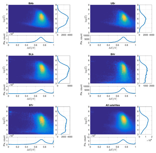 First, we start with the statistics of against fitted activation energy. The 3D histograms of dependency between the identified activation energy and the values of the prefactors are presented in Figure 10. In this analysis, we include the pixels with at least two metastable states which constitute the majority (∼80%) of detected faulty pixels. The cumulative histograms of the data projected on both the x and y axes are plotted at the respective sides of each 3D histogram. This technique of data presentation was adopted in all consecutive plots in this part of the paper. We can see that most of the data points are concentrated around the activation energy of 0.7–0.75 eV with a peak at approximately 0.72 eV and in between 6–7. The shielded satellites have smaller closer to 6. In these two satellites, we can see that the smaller values of prefactor are present, even as small as . In contrast, in BAb and UBr, the values lower than 4 are not present, while in BLb, some appear only occasionally. This observation indicates that utilization of shielding reduces the intensity of DC due to the lower values of prefactor .