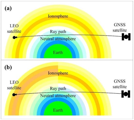 Radio occultation geometry between global navigation satellite system (GNSS) transmitter and low Earth orbit (LEO) receiver satellites, schematically illustrating the signal ray path passing through the ionosphere and the atmosphere, as well as the overall local spherical symmetry assumption (a) in contrast to the bi-local spherical symmetry assumption (b).