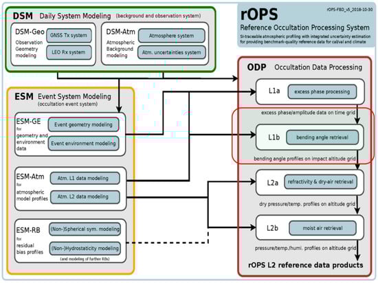 The rOPS is a reference occultation processing system [33,34], developed at the Wegener Center for Climate and Global Change (WEGC) at the University of Graz, Austria, that aims to realize the benchmark quality potential of RO by establishing (1) a reliable and accurate retrieval with residual relative numerical uncertainties below 10−4, and (2) integrating a complete uncertainty propagation chain from RO raw tracking data and high accuracy GNSS orbit data, and relevant side influences, through four processors to atmospheric profiles [35]. Figure 2 shows the main components of the rOPS as well as the main interactions, where the occultation data processing (ODP) subsystem is the core subsystem provided for the retrieval of the level one and level two profiles [36,37,38,39,40].