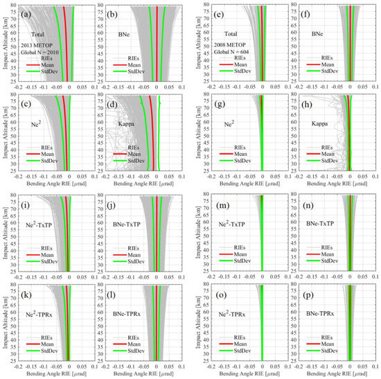 In Figure 6, similarly, for the GRACE and CHAMP missions, the BNe terms have negative and positive values, while all the Ne2 terms are negative. However, in the 2008 CHAMP mission ensemble data set, the average bias of the BNe term (Figure 6f) has a clear negative tendency, which causes the mean of the total bending angle RIE to be larger than that of the Ne2 terms alone. In both Figure 5 and Figure 6, comparing the profiles and statistics of the inbound Ne2 (Figure 5i,m and Figure 6i,m) and outbound Ne2 (Figure 5k,o and Figure 6k,o) terms, one can see that the inbound Ne2 terms are larger than those of the outbound. Whereas, comparing the profiles and statistics of the inbound BNe (Figure 5j,n and Figure 6j,n) and outbound BNe (Figure 5l,p and Figure 6l,p) terms, the inbound BNe terms are not always larger than those of the outbound. Specifically, the outbound BNe terms of the MetOp-A/-B missions (Figure 5l,p) are smaller than those of the inbound, while the outbound BNe terms of the GRACE (Figure 6l) and CHAMP (Figure 6p) missions are slightly larger than those of the inbound.