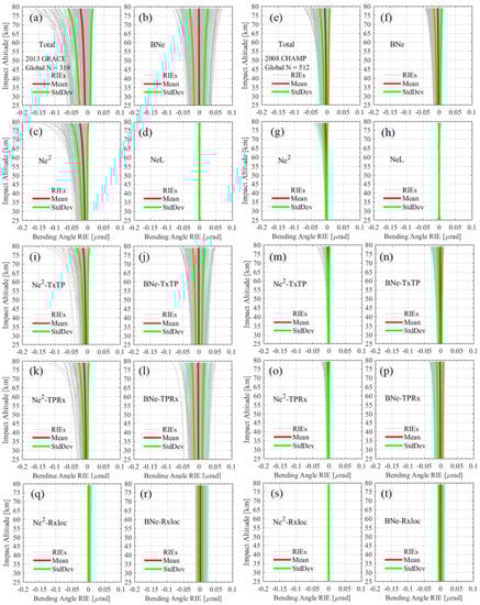Bi-local bending angle RIE correction profiles and their statistics for the global ensemble high solar activity data set (left columns, the Gravity Recovery And Climate Experiment (GRACE) mission on 15 May and 15 July 2013) and low solar activity data set (right columns, Challenging Mini-satellite Payload (CHAMP) mission on 14–16 July 2008). In the upper composite panels (top two rows), the total bi-local bending angle correction (Total) and its BNe, Ne2, and NeL component terms are shown by subpanels (a–d) and (e–h). The lower composite panels (third and fourth row) show the inbound (TxTP) and outbound (TPRx) components of the Ne2 and BNe terms, in panels (i–l) and (m–p), respectively. The bottom row panels show the Rx local (Rxloc) component of the Ne2 and BNe terms, in panels (q,r) and (s,t), respectively.
