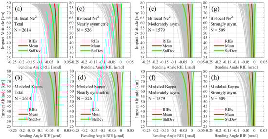 To make a fair comparison between the bi-local Ne2 term and the Kappa bending angle RIE, we furthermore used Equation (9) to obtain modeled Kappa bending angle RIE correction profiles, based on the IGS vTEC maps and NeUoG ionospheric model. Results comparing these with the bi-local Ne2 term for different categories of ionospheric asymmetry are shown in Figure 7. One can see that the modeled Kappa bending angle RIEs are smoother than when using observed bending angles, and the total mean is similar to the total mean of the bi-local Ne2 terms, as shown in Figure 7a,b. However, in individual profiles, Kappa bending angle RIEs can be larger in size than those of the bi-local Ne2 terms. The reason for this is discussed in more detail below.