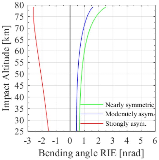 Difference profiles of the mean bi-local Ne2 term and modeled Kappa bending angle RIEs (i.e., mean bi-local Ne2 minus mean modeled Kappa) for the classified nearly symmetric (green line), moderately asymmetric (blue line), and strongly asymmetric (red line) data sets, as illustrated in Figure 7.