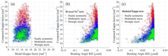 Scatter plots of Kappa factor and bending angle RIE term values at 60 km impact altitude level illustrating the computed Kappa factor vs. the model-Kappa factor (according to [25]) in panel (a) as well as vs. the bi-local Ne2 term in panel (b) and vs. the modeled Kappa term in panel (c), respectively. Colors of the circles indicate the three classes of nearly symmetric (green), moderately asymmetric (blue), and strongly asymmetric (red) data sets (as illustrated in Figure 3d).