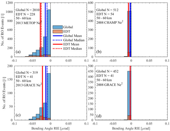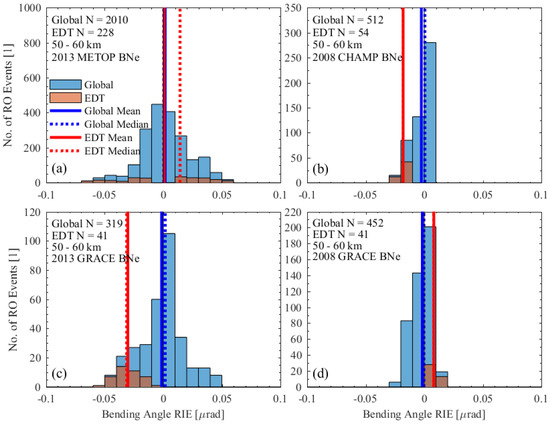 Relationship between the histogram distribution of the number of RO events and the average value of the bi-local BNe term over 50–60 km impact altitude range for high solar activity data (left column, MetOp-A/-B (a) and GRACE (c) on 15 May and 15 July 2013) and low solar activity data (right column, CHAMP (b) and GRACE (d) on 14–16 July 2008). In each panel, the global (blue) and EDT (red) ensembles are presented as well as the global mean, global median, EDT mean, and EDT median as vertical lines in the corresponding colors (see legend in panel (a)).
