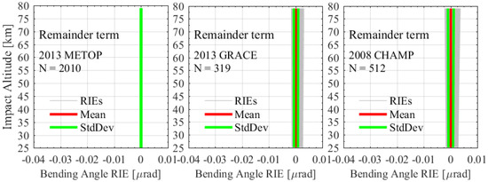 Figure 12 shows the remainder term (last term of Equation (11)) for the MetOp, GRACE and CHAMP global ensemble data sets, for which the various RIE terms were illustrated in Figure 5 and Figure 6. As can be seen, the remainder term is, in all cases, small compared to the BNe-Rxloc terms in Figure 6r,t, showing that the actual dependency on the orbit altitude is very small.