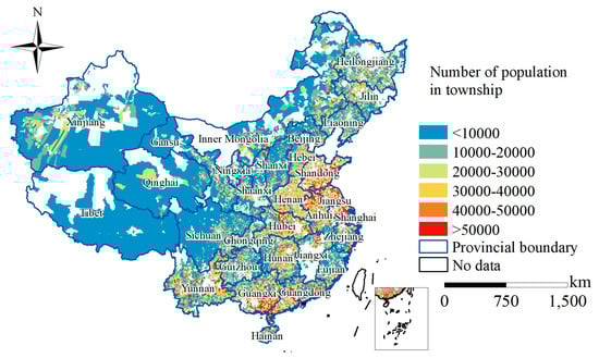Additionally, 2867 county-level censuses, with a total of 1,374,620,000 people, were obtained and were used as the dependent variable in order to establish the RF model. The township level is the smallest unit of the census in China, and is a lower administrative unit than the county level. This study also obtained 28,505 township censuses (accounting for 74% of all of the townships in China), which were employed in order to analyze the model’s accuracy (Figure 1).