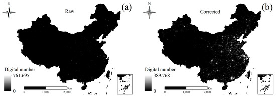The NPP/VIIRS data in mainland China in 2015. (a) The raw NPP/VIIRS data; (b) the corrected NPP/VIIRS data.