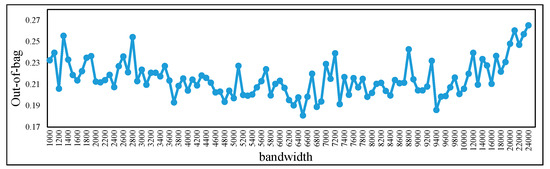 First, the 10 types of discrete POI point data (vector) are utilized to generate 10 smooth surfaces (the raster layer) of 100 m × 100 m through the KDE with a 6500 m bandwidth, respectively. KDE can calculate the density of a certain type of POI point within a given range. The optimal bandwidth is determined as follows: when setting the bandwidth, the step length is set to 100 m in the range of 1000–10,000 m, and the step length is set to 1000 m in the range of 10,000–24,000 m. Then, a total of 105 different bandwidths are set, and 1050 corresponding POI density layers (105 times × 10 layers) are generated in sequence. Next, the county-level 10 POI density layer is generated by different bandwidths, respectively. Finally, taking 10 POI county-level sums as the independent variables, and the county-level census as the dependent variable, an RF regression model is built. A total of 105 RF regression models were constructed in this study. The bandwidth corresponding to the minimum out-of-bag error value of the 105th RF model is the optimal bandwidth. ‘Out-of-bag’ is an unbiased estimate of the RF generalization error [30]. The smaller the out-of-bag value, the smaller the model error. The out-of-bag experienced a process of decreasing first and then increasing (Figure 4). When the bandwidth is 6500, the out-of-bag value is the lowest.