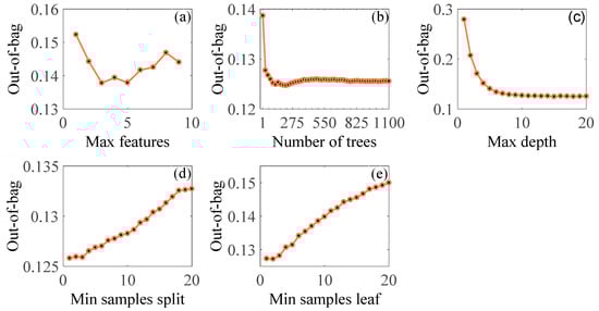 The out-of-bag values with different parameters. (a) Max features; (b) number of trees; (c) max depth; (d) min samples split; (e) min samples leaf.
