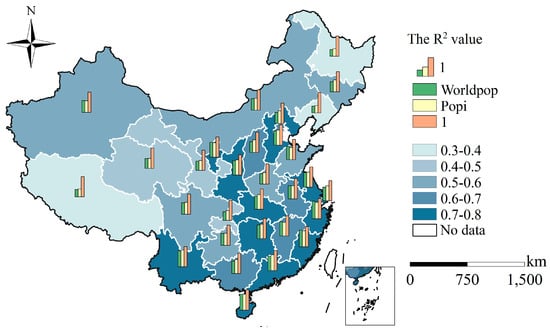 In order to analyze the accuracy of the different regions, we calculated the R2 between the township census and the estimated township population in 30 provinces. As seen from Figure 8, the R2 value of the Popi product in 22 provinces is higher than that of the Worldpop product, and the R2 value of the Worldpop product in eight provinces is higher than that of the Popi product.