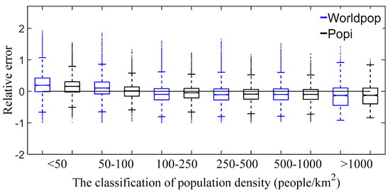 In order to analyze the relationship between the population density of the townships and RE, we divided the population density of the townships into six classifications, as shown in Figure 9. Overall, the RE values of the two products are mostly distributed in the range of −0.25 to 0.25. The distribution of the RE values in the Popi data are more concentrated, with fewer extreme points, and the median of the RE values is closer to 0. The distribution of the RE values in the Worldpop dataset is more scattered, with more extreme values.