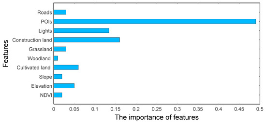 In order to analyze the importance of the independent variables, the feature importance indicator was calculated. The feature importance is the degree of influence on the accuracy of the RF model when an independent variable is replaced by randomly distributed data. If the independent variables do not participate in the model’s training, the model’s accuracy will decrease. The higher the feature’s importance, the more important the independent variables, and vice versa. The feature importance of the RF model is shown in Figure 10.