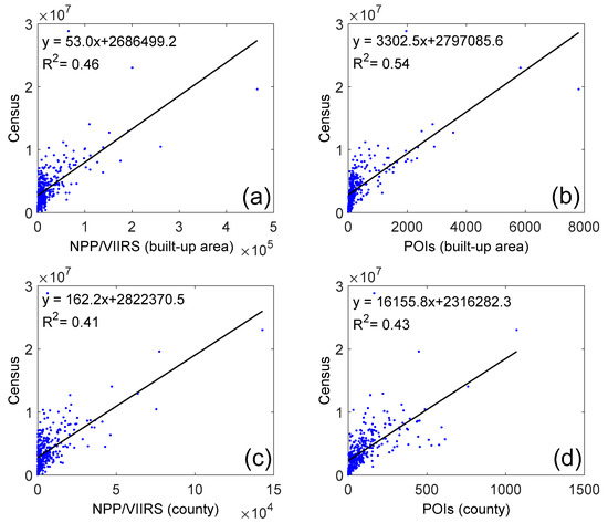 The census data with respect to the National Polar-orbiting Operational Environmental Satellite System Preparatory Project/Visible Infrared Imaging Radiometer (NPP/VIIRS) and point of interest (POI) at the city level (using urban construction land and rural construction land in the 2015 LULC data as masks, the built-up areas and rural areas of 340 cities in mainland China were extracted, respectively). (a) The census data with respect to the NPP/VIIRS data in built-up area; (b) the census data with respect to the POIs data in built-up area; (c) the census data with respect to the NPP/VIIRS data in county; (d) the census data with respect to the POIs data in county.