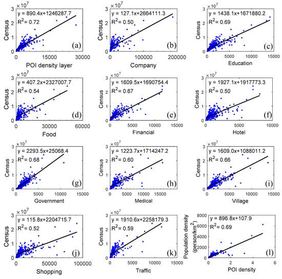 The relationship between the census and different type POI data at the city level. (a) POI density layer (the POI density layer is the combination of the 10 individual POI layers using the entropy weight method); (b) the company type POI data; (c) the education type POI data; (d) the food type POI data; (e) the financial type POI data; (f) the hotel type POI data; (g) the government type POI data; (h) the medical type POI data; (i) the village type POI data; (j) the shopping type POI data; (k) the traffic type POI data; (l) the POI density data.