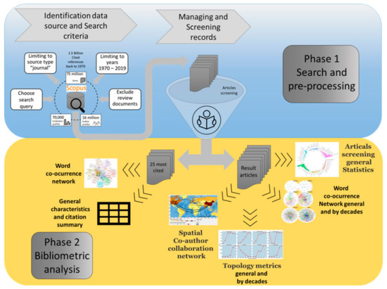 In this study, we choose the Scopus database. Scopus is the multidisciplinary largest database of abstracts and references in the literature, accounting for more than 24,000 peer-reviewed journals and 5000 international publishers and citations [37]. It has efficient analysis tools for retrieving and aggregating information and data exportation in multiple formats, which offers a comprehensive overview of the total volume of the world’s research products in the areas of science, technology, medicine, social sciences, arts, and humanities. For these reasons, we employed Scopus as the database literature for this research.