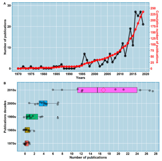 The total number of 235 documents was published between 1970–2019 (see Supplementary Materials Table S1 for details) with a mean and standard deviation of 4.7 ± 7.2 papers/year (Figure 2A,B). The number of cumulative publications in the later years increased significantly, being more than twenty-five by the year 2019 (Figure 2A). The first peak of productivity was evident from the mid-1990s, with a peak in 1996 with seven articles, which comprised 3% of the total productivity in the studied period. The highest peak of productivity was observed in 2016 and 2018. Both years accounted for 27 articles, which corresponds to 23% of the total productivity in that decade. This decadal period has the highest number of publications with 168, which corresponds to 71.5% of the total number of published documents in this 50-year time frame with a mean value of 16.8 ± 7.6 publications. This is followed by the 2000s with 17% (mean 4 ± 1.8 SD), 1990s, 8.1% (mean 1.9 ± 2.1 SD), 1980s, 2.1% (mean 0.5 ± 0.7 SD) and 1970s, 1.3% (mean 0.3 ± 0.5 SD). The majority of the retrieved documents were published in English (e.g., 93.2% = 231 manuscripts), followed by 15 documents in Chinese (~6.0%) and one document in Croatian (0.4%).