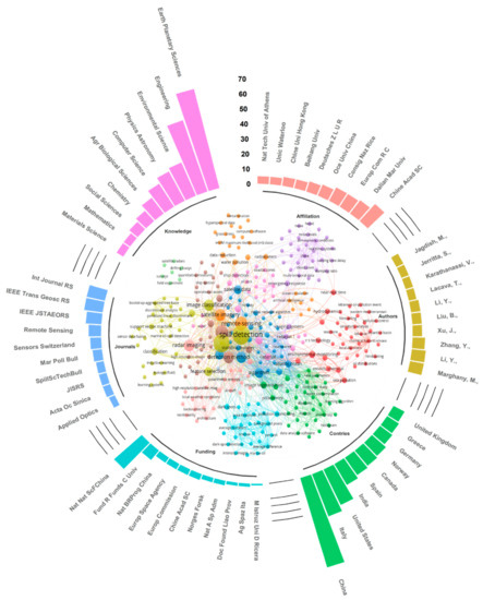 Similar to what was previously described, if one considered the number of institutions that funded scientific research related to OSPM, 59 names showed up, with an average of 4% institutions or organizations per publication. It is possible to show that among this top 10, 50% are Chinese, 20% European, 30% from the United States, and 10% each for Italy and Norway (Figure 3, Table S2). The National Natural Science Foundation of China ranked first, with a total of 24 documents (10.2% of the total), followed by Fundamental Research Funds for the Central Universities, Chinese Academy of Sciences, European Commission, European Space Agency, National Basic Research Program of China, National Aeronautics and Space Administration, Norges forskningsråd, Agenzia Spaziale Italiana, Doctoral Start-up Foundation of Liaoning Province, Ministero dell ‘Istruzione Ministero dell’ Università e della Ricerca, with 8 (3.4% of the total), 4 (1.7% of the total), 4 (1.7% of the total),4 (1.7% of the total),4 (1.7% of the total), 3 (1.3% of the total), 3 (1.3% of the total), 2 (0.9% of the total), 2 (0.9% of the total) and 1 (0.4% of the total) documents, respectively (Figure 3, Table S2).