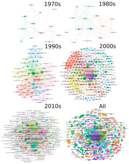 The ten words with the highest number of co-occurrences between decadal networks and the worldwide network, in general, were spill detection SAR image, marine pollution, remote sensing, image analysis, detection method, satellite imagery, algorithm, neural network, feature selection. These words are a strong indication that they represent important conceptual and methodological constructs associated with OSPM research literature. The largest cluster of each of the co-word networks and the broad network, including all five decades, was associated with the methods used to detect and monitor oil spots, classification algorithms, types of images, and investigated targets (Figure 5).